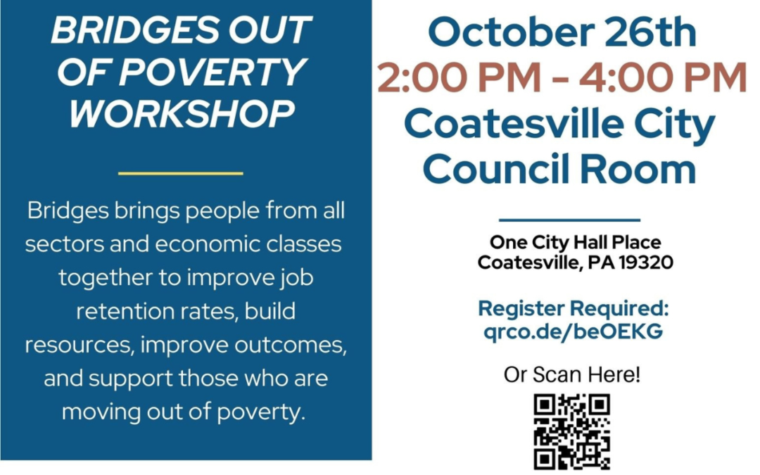 West Chester, Pa. (October 13, 2023) – To help build a clearer understanding of the root causes of poverty and develop community-based solutions to build economic opportunity, a “Bridges Out of Poverty” workshop will be held at Coatesville City Hall, on Thursday, October 26th at 2 p.m.
