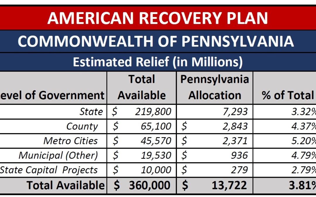 In total, according to estimates from the Pennsylvania Senate Democratic Appropriations Committee, the Commonwealth is expected to receive $13.722 billion in state and local relief, including: