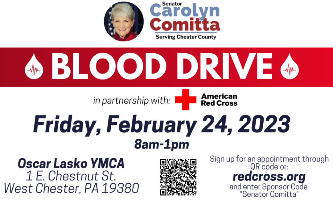 West Chester, Pa (January 5, 2023) – To help ensure local blood banks have the critical supply they need, State Senator Carolyn Comitta is partnering with the American Red Cross and the Oscar Lasko YMCA to host a blood donation drive on Friday, February 24th.