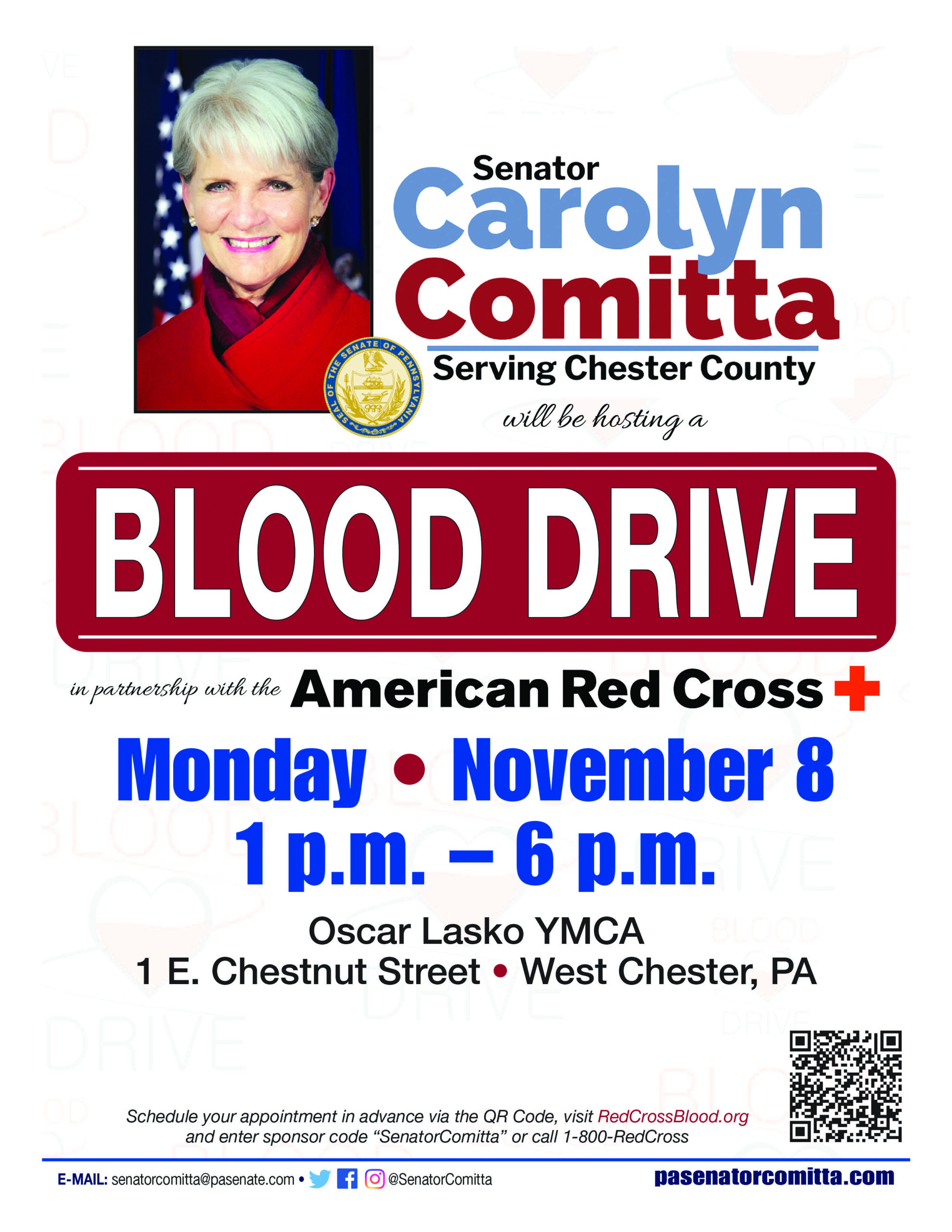 WEST CHESTER (October 21, 2021) – In response to an ongoing blood shortage, state Senator Carolyn Comitta in partnership with the American Red Cross and the Oscar Lasko YMCA is hosting a blood drive on Monday, November 8 from 1 p.m. to 6 p.m.