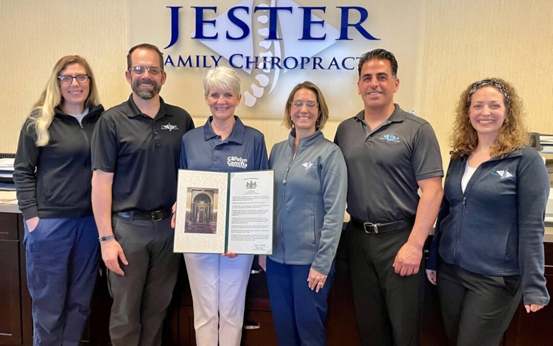 In recognition of Correct Posture Month, Senator Comitta visited Jester Family Chiropractic in West Chester and presented the resolution to Dr. Deron Jester (BS, DC, CCWP, CPN), Dr. Jennifer Jester (BS, DC, CFMP), Dr. Greg Parsons (BC, DC), and the Jester team.