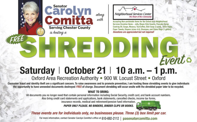 West Chester, PA (October 4, 2023) – To help residents securely dispose of sensitive documents and personal information, state Senator Carolyn Comitta is hosting a free community shredding event on Saturday, October 21 from 10 a.m. – 1 p.m. at the Oxford Area Recreation Authority.