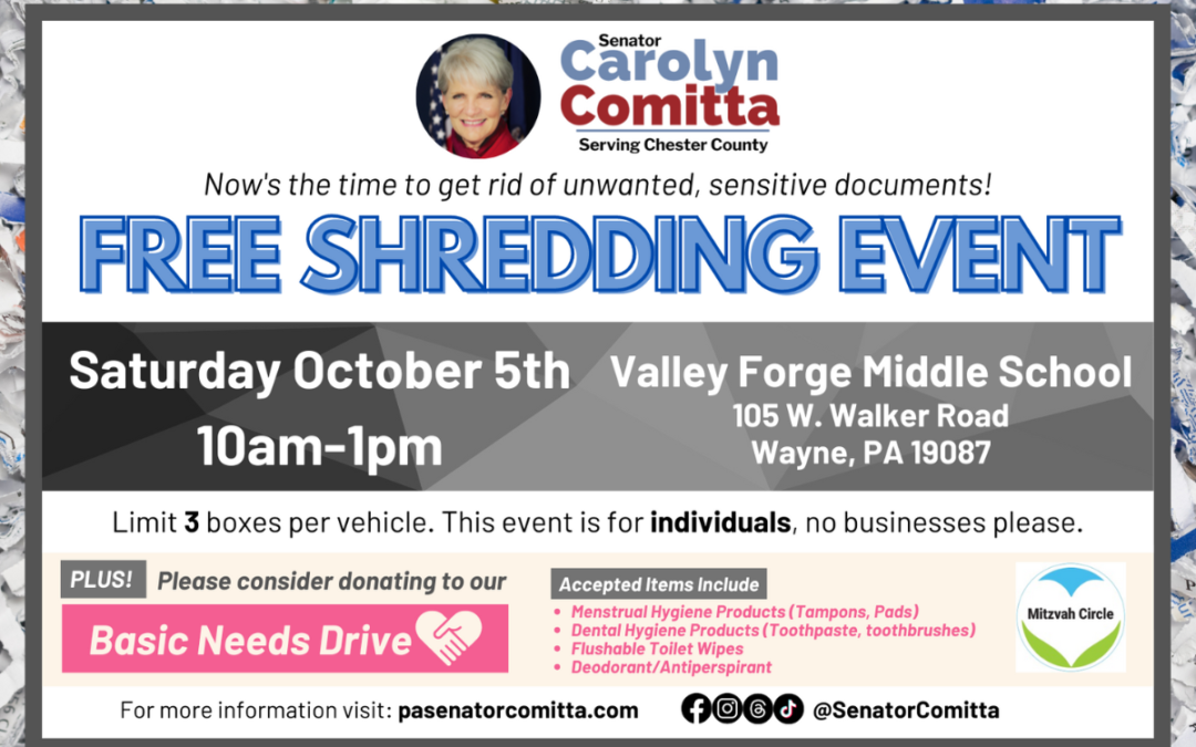 West Chester, Pa (September 24, 2024) – To help safely and securely dispose of documents containing sensitive information, state Senator Carolyn Comitta is holding a free community shredding event at Valley Forge Middle School on Saturday October 5 from 10 a.m. to 1 p.m.