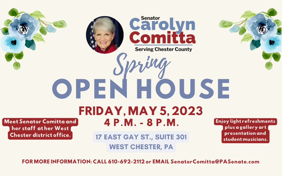 Walk-ins welcome or you can register for the Spring Open House at www.pasenatorcomitta.com/district-office-open-house-may-5-2023
