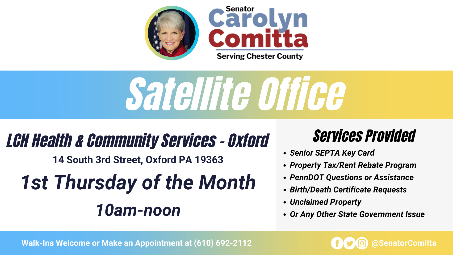 Staff members are available to assist residents with a number of issues, including applying for the Property Tax and Rent Rebate Program, SEPTA Key Senior ID Cards, Birth Certificates, Unclaimed Property, and more.