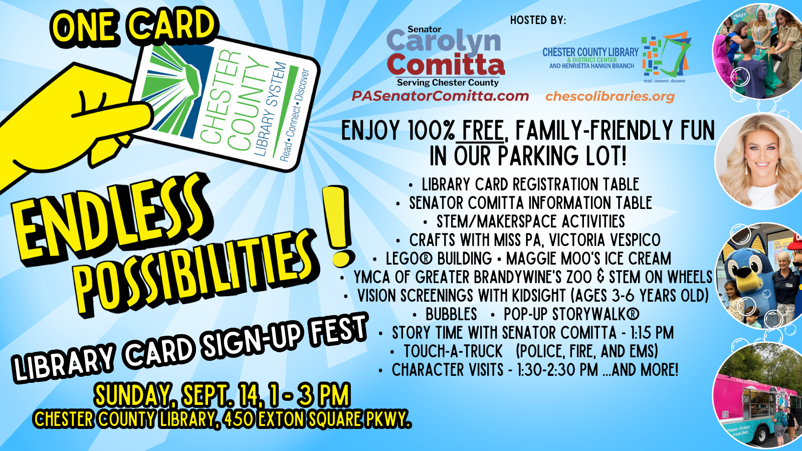 Children, families, and residents are invited to explore the endless possibilities with a library card at the Chester County Library and State Senator Carolyn Comitta’s Library Card Sign Up Fest.